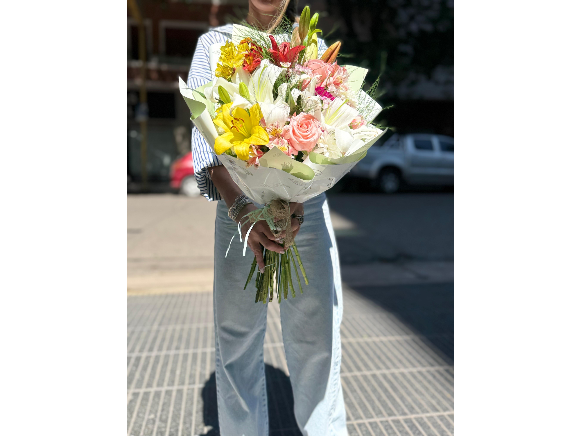 Te aseguramos es que tu ramo incluirá varas de flores frescas de estación, cuidadosamente seleccionadas y combinadas para lograr una presentación armoniosa y colorida.