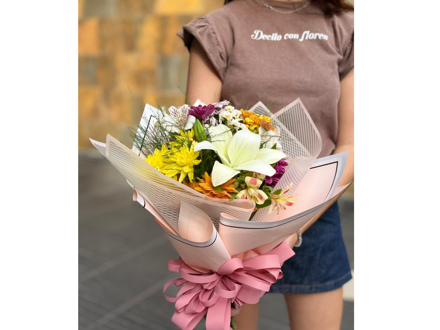 Ramo mixto de flores frescas. Compuesto por lilium protagonista, astromelias, margaritas, en tonos vibrantes que simbolizan fuerza, luz y autenticidad.