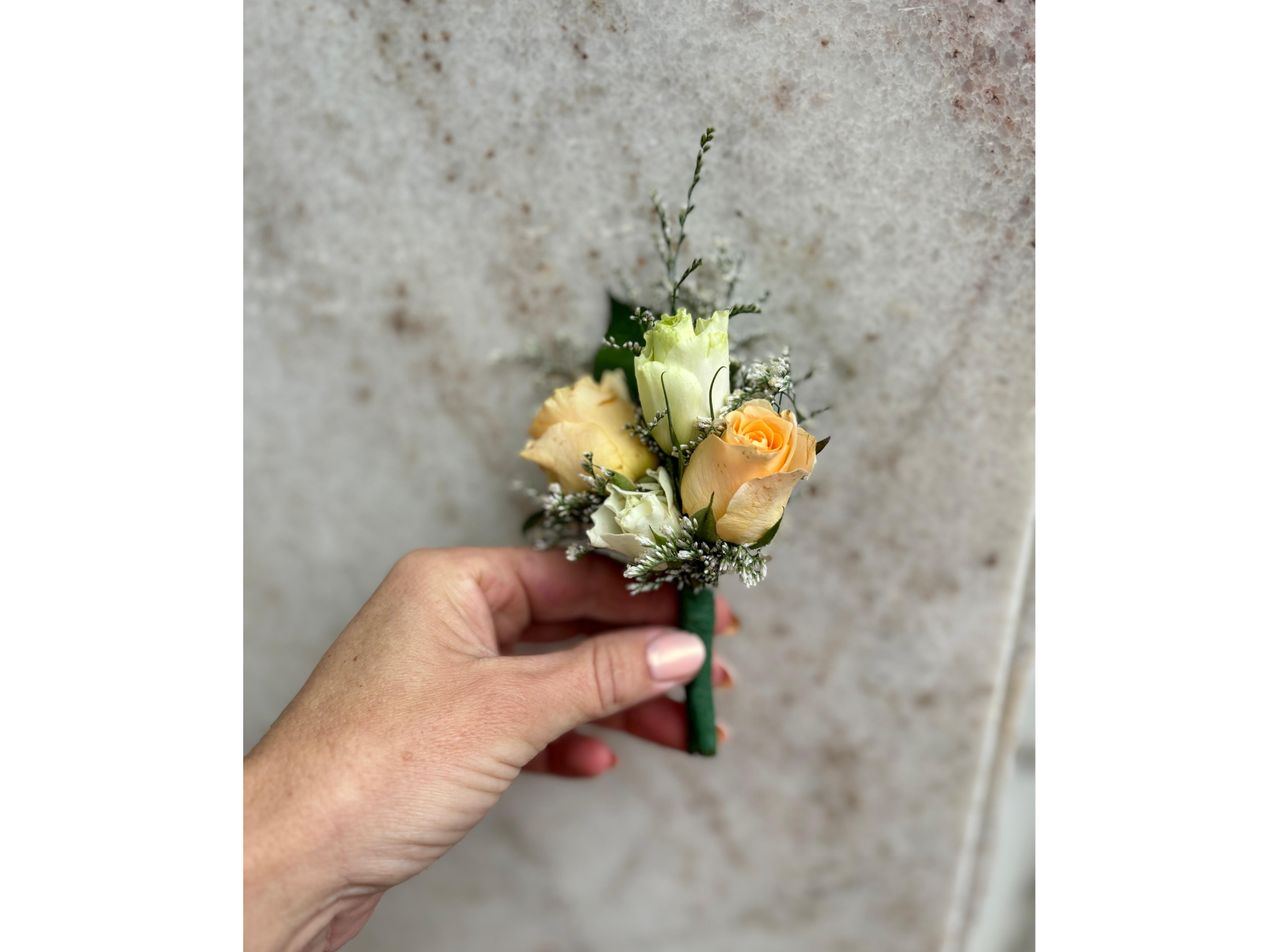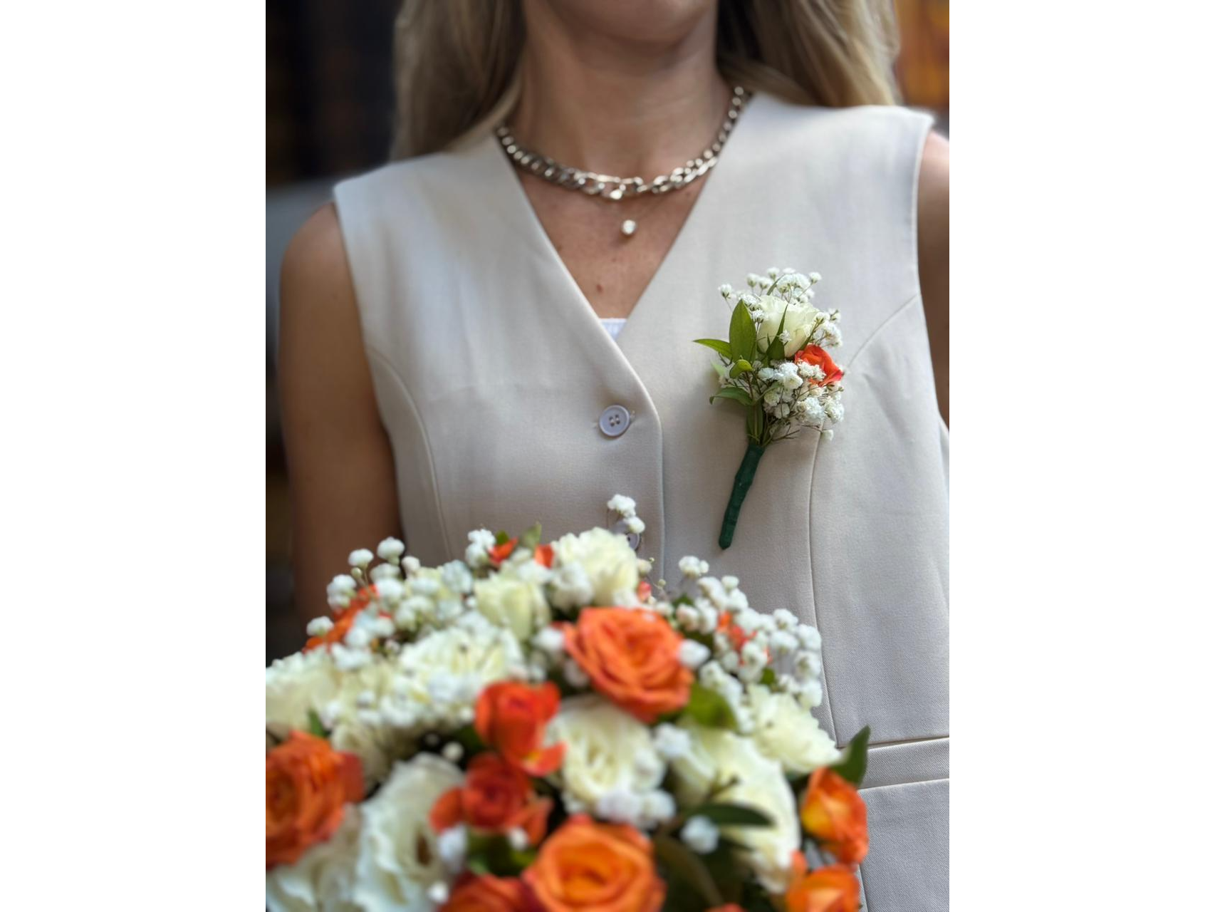 El boutonier es un pequeño detalle floral que lleva el novio en la solapa, combinando con el ramo de la novia. Está diseñado con delicadeza y armonía, utilizando las mismas flores o tonos para lograr una estética elegante y coherente en toda la ceremonia.